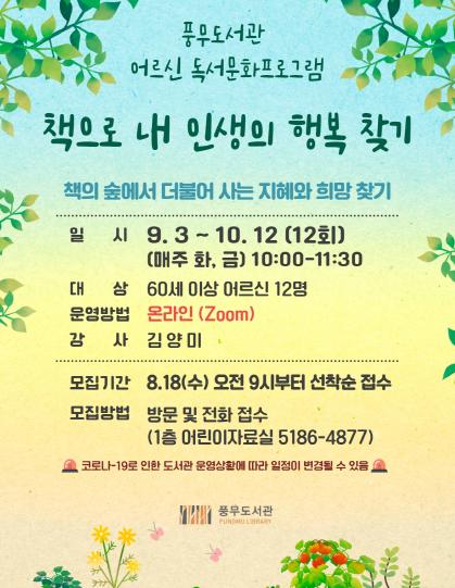 김포시 풍무도서관은 9월 3일부터 60세 이상 어르신을 대상으로 독서문화프로그램 「책으로 내 인생의 행복 찾기」를 운영한다.