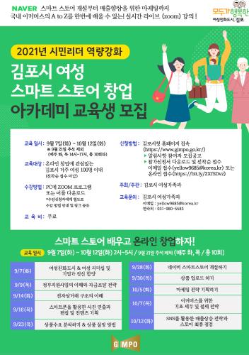 교육 기간은 2021년 9월 7일부터 10월 12일까지 14시부터 17시, 1일 3시간, 주 2회, 총 10회차로 운영되며, 교육은 ▲여성친화도시 & 여성 리더십 및 기업가 정신 함양 교육, ▲전자상거래 구조의 이해, ▲스마트폰 활용 사진 연출, 편집 및 기획, ▲스마트 스토어 개설, ▲마케팅 전략 기획, ▲기초 세무 교육 등으로 구성되며, 네이버 스마트 스토어 창업 및 관리에 대해 배울 수 있는 기회를 제공한다. 기타 자세한 사항은 홈페이지 알림 사항을 참고하거나 김포시 여성가족과로 문의하면 된다.