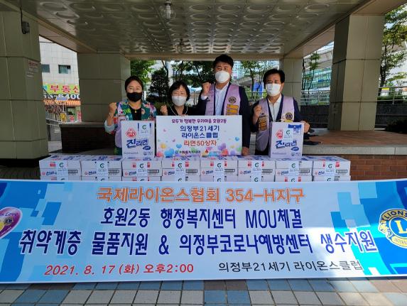 의정부 21세기 라이온스 클럽에서는 협약식에 이어 취약계층을 위한 라면 50상자를 호원2동에 전달하였으며, 코로나19 최일선에서 노력하는 의정부시예방접종센터 관계자들을 위해 생수 2천병을 지원하는 등 통 큰 기부 행보를 이어 나가고 있다.