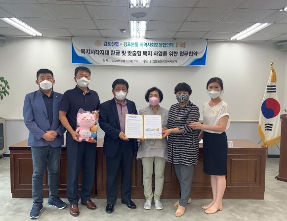 김포본동지역사회보장협의체(공동위원장 윤은주, 박남순)와 김포신협(이사장 이완택)은 지난 8월 12일 김포본동 소회의실에서 지역사회 인적 안전망 구축을 위한 업무협약을 체결했다.