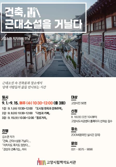고양시 백석도서관은 오는 9월, 독서의 달을 기념하여 '건축, 근대소설을 거닐다'저자인 김소연 작가를 초청해 강연을 진행한다.