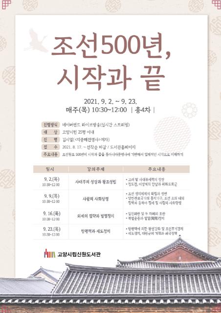 고양시 신원도서관에서는 9월 2일부터 23일까지 매주 목요일 독서의 달 특별 인문학 강연‘조선500년, 시작과 끝’을 운영한다고 밝혔다.