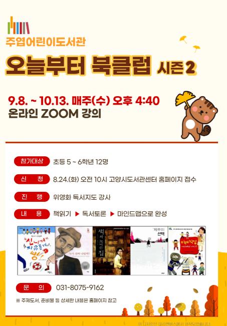 고양시 주엽어린이도서관은 독서의 달을 맞아 어린이들에게 독서의 즐거움을 선사하고자 오는 9월부터 온라인 독서토론 '오늘부터 북클럽 시즌2'를 운영한다.