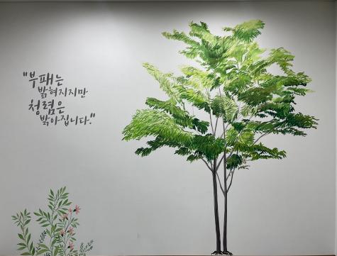 특히 운정2동 전 직원의 참여와 투표를 통해 1등으로 선정된 표어 ‘부패는 밝혀지지만 청렴은 밝아집니다’를 복지상담실에 벽화로 제작해 직원들의 청렴활동에는 동기부여를, 상담실을 방문하는 민원인에게는 신뢰감을 줄 수 있도록 했다.