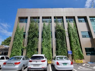 파주시농업기술센터 본관 건물 외벽에 덩굴식물을 이용해 그린커튼을 만들었고, 에너지절약 및 녹색식물 재배를 통한 탄소배출량 감소 효과를 기대하고 있다.