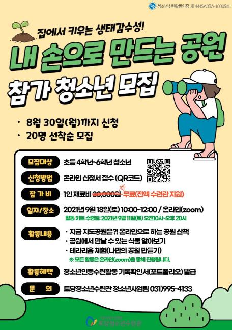 고양시청소년재단 토당청소년수련관은 코로나19 장기화로 야외활동이 위축되어있는 환경에서 청소년들이 안전하고 유익한 체험활동에 참여할 수 있도록 청소년수련활동인증프로그램 ‘내 손으로 만드는 공원’을 9월 18일(토) 10시부터 온라인(zoom)으로 진행한다.