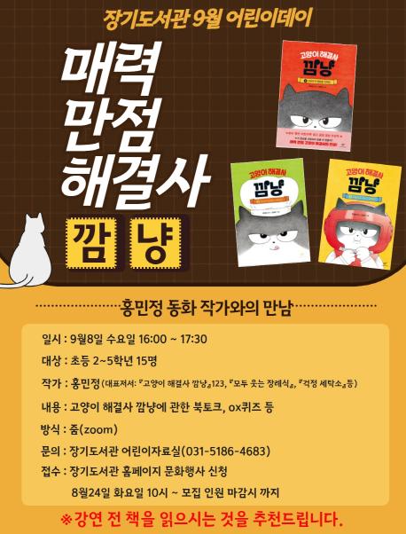 김포시 장기도서관은 오는 2021년 9월 8일 수요일 16시부터 17시30분까지 관내 어린이를 대상으로 장기도서관 9월 어린이데이 '매력 만점 해결사 깜냥' 강좌를 비대면 온라인 실시간 방송(Zoom)으로 운영한다.