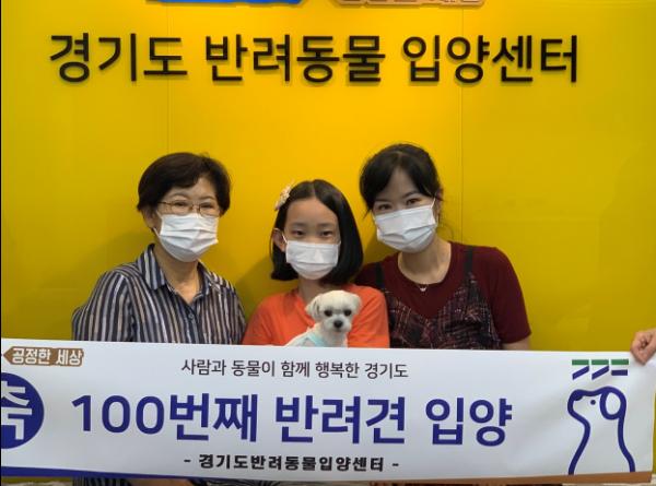 유기동물 입양문화 확산을 위해 지난해 10월 수원에 문을 연 ‘경기도 반려동물 입양센터’에서 100번째 입양견이 탄생했다.