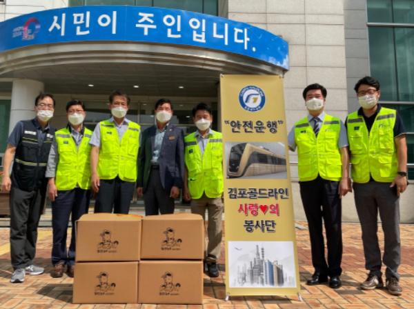 김포시는 김포골드라인(주) 임직원들로 구성된 사랑의 봉사단(회장 장항진)이 20일 양촌읍행정복지센터 맞춤형복지팀과 함께 정성이 가득 담긴 생필품 세트를 가구 방문하여 전달했다고 밝혔다.