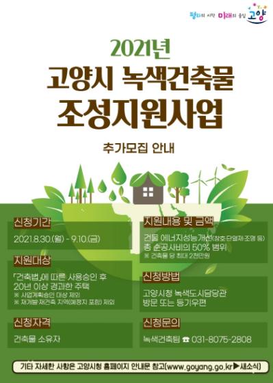 고양시가 노후주택의 에너지효율 향상과 시민의 주거환경 개선을 위한 “2021년 녹색건축물 조성 지원 사업” 대상자를 내달 10일까지 추가 모집한다.