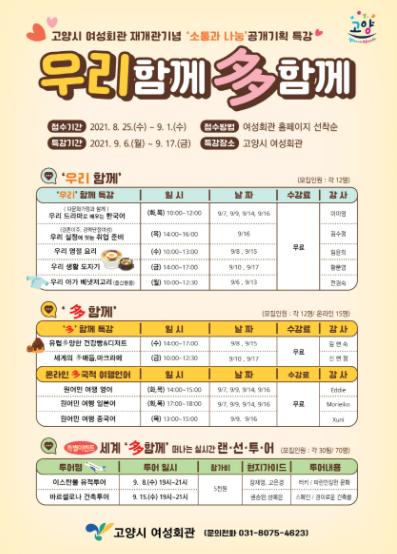 고양시 여성회관이 재개관을 기념해 ‘소통과 나눔’이라는 메시지를 담은 특별 공개강좌 「우리함께 多함께」를 오는 9월 6일부터 2주간 운영한다.