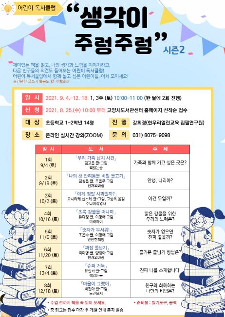 고양시 백석도서관은 오는 9월, 초등학교 1~2학년을 대상으로 어린이 독서클럽 '생각이 주렁주렁' 시즌 2를 운영한다.