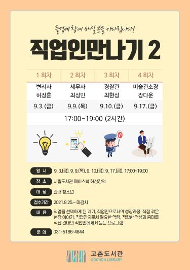 고촌도서관의 「직업인 만나기2」는 관내 어린이 및 청소년을 위한 직업·진로 종합 프로그램으로 관내의 다양한 직업인들을 만나게 되는 페이스북 강좌이다.
