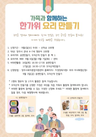 양주시육아종합지원센터는 추석을 맞아 ‘가족과 함께하는 한가위 요리만들기’ 프로그램 참여자를 선착순으로 모집한다.