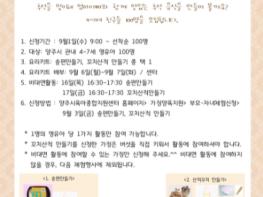모집인원은 총 100명으로 4~7세 영유아 가족이 참여 가능하며 신청희망자는 양주시육아종합지원센터 홈페이지에서 온라인으로 신청하면 된다.