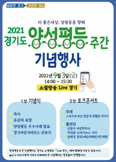 양성평등주간은 범국민적으로 양성평등 실현을 촉진하기 위해 지정한 기념주간으로 2019년까지 7월에 운영되다가 우리나라 최초의 여성인권선언문인 ‘여권통문’이 발표된 1898년 9월 1일을 기념해 2020년부터 9월 1~7일을 양성평등주간으로 하고 있다. 지난해에는 코로나19로 행사를 열지 못해 올해가 경기도의 9월 양성평등주간 첫 행사다.