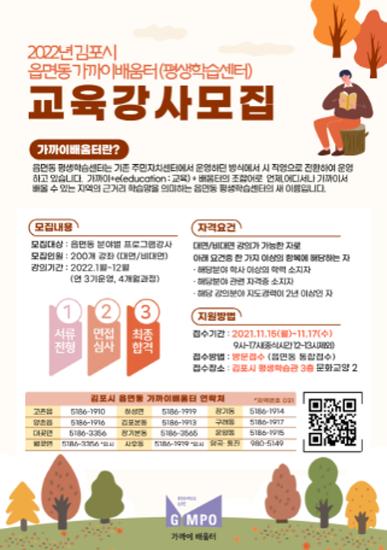 김포시는 생활밀착형 학습문화 조성을 위한 읍·면·동 가까이배움터(구 읍·면·동 평생학습센터) 운영을 위해 유능한 교육 강사를 모집한다.