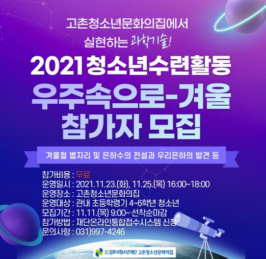 (재)김포시청소년재단 고촌청소년문화의집에서는 관내 청소년에게 천문·우주에 대한 체험활동 및 정보제공을 통한 과학적 지식과 창의력 함양 및 전문적 능력을 향상할 수 있는 기회를 마련하기 위래 ‘우주속으로-겨울’을 운영한다.