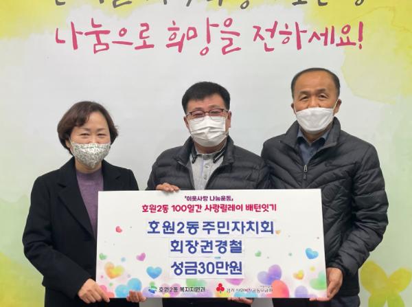 의정부시 호원2동은 11월 9일 권경철 호원2동 주민자치회장이 100일 사랑릴레이 배턴 잇기 동참의 뜻으로 성금 30만 원을 기탁했다고 밝혔다.