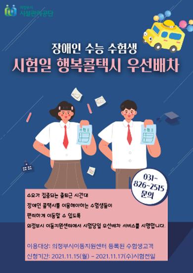 의정부시시설관리공단은 2022학년도 대학 수학능력 시험(2021. 11. 18.)을 치르는 장애인 수험생을 위하여 ‘행복콜택시 우선 배차 서비스’ 를 실시한다고 밝혔다.