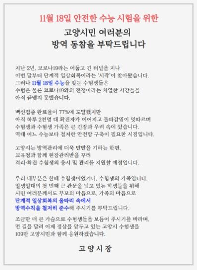 고양시가 11월 18일 2022년도 수능을 앞두고 방역수칙 준수 동참을 촉구하는 대시민 호소문을 발표했다.