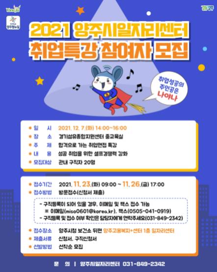 양주시일자리센터는 오는 12월 7일 개최 예정인 ‘2021년 취업특강’ 참여자를 모집한다고 밝혔다.