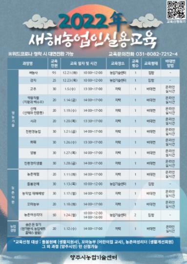 2022년 새해농업인실용교육은 12월10일까지 온라인 설문지를 통해 사전접수 받고 있으며, ‘양주농업’카카오채널과 리플릿 QR코드를 통해 접속할 수 있다. 참석을 희망하는 시민은 사전접수를 하고, 비대면 과정의 경우 교재를 택배로 수령받아, 개인 스마트폰이나 PC를 활용해 과정별 온라인 플랫폼(줌)을 설치하면 교육에 참여할 수 있다.