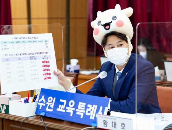 경기도의회 교육행정위원회 황대호 의원(더불어민주당, 수원4)은 16일 경기도교육청을 대상으로 실시된 2021년도 행정사무감사 총괄감사에서 수원시와 울산광역시 간 교육 현황을 비교하며 수원특례시의 수요와 규모에 맞는 교육재정 지원이 이루어져야 한다고 촉구했다.