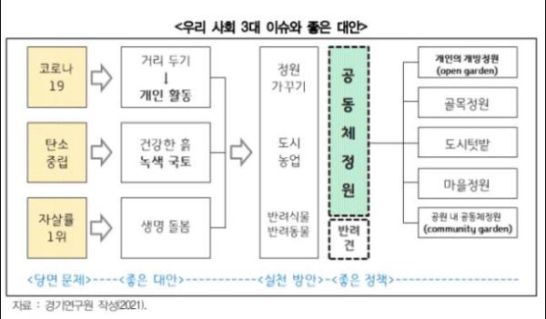 연구원은 이러한 정원문화가 코로나19, 탄소중립, 심각한 자살률 등 현안 해결에 좋은 대안이라고 주장했다. 코로나19 거리두기로 개인 활동 또는 소모임이 늘어난 만큼 정원 가꾸기가 더 주목받고, 도시농업을 통한 나무 심기와 건강한 흙이 탄소중립 실현에 부합하고, 반려식물 문화를 통한 생명 존중이 자살 예방에 기여할 수 있기 때문이다.
