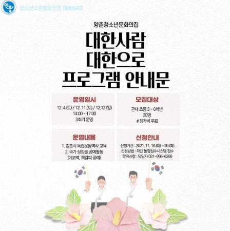 (재)김포시청소년재단 양촌청소년문화의집에서는 관내 청소년에게 우리 김포시의 일제강점기 독립운동역사에 대한 전문교육 및 체험활동을 통한 역사에 대한 관심도 향상을 위한 수련활동인증 제8664호 ‘대한사람 대한으로’를 운영한다.