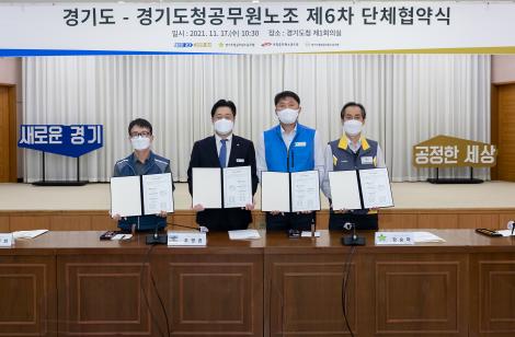 오병권 경기도지사 권한대행과 강순하 경기도청공무원노동조합 위원장, 윤석희 전국공무원노동조합 경기도청지부장, 백승진 경기도통합공무원노동조합 위원장은 17일 경기도청 제1회의실에서 제6차 단체협약서에 서명했다.