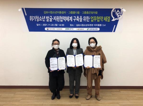 김포시청소년재단 청소년이동쉼터는 위기청소년의 발굴과 인적·물적 지원협력체계 구축을 위해 ‘그룹홈-다움’, ‘그룹홈-은빛마을’과 11월 22일 각각 업무협약을 체결했다.
