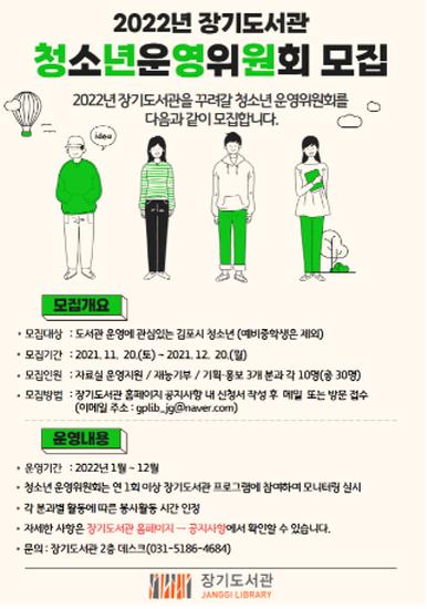 김포시립도서관 장기도서관은 2022년 제4기 청소년운영위원회 위원으로 활동할 청소년을 2021년 11월 20일부터 2021년 12월 20일까지 모집한다.