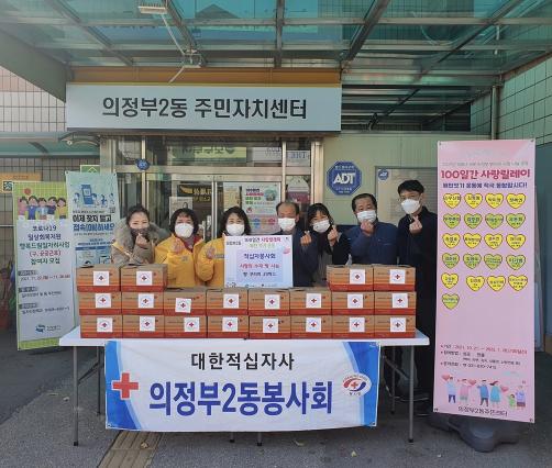 의정부시 의정부2동적십자봉사회는 11월 23일 카스텔라 머핀과 먹물연유 빵이 가득 담긴 빵 꾸러미 20상자를 의정부2동주민센터에 기탁했다.