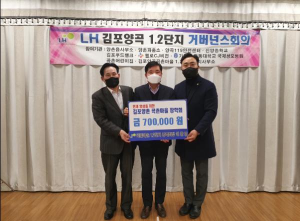 김포시 양촌읍은 지난 23일 양곡 1?2단지 주거행복지원센터(센터장 이한영)에서 관내 생활이 어려운 가정의 학생을 위한 장학금 70만원을 양촌읍에 기탁했다고 밝혔다.
