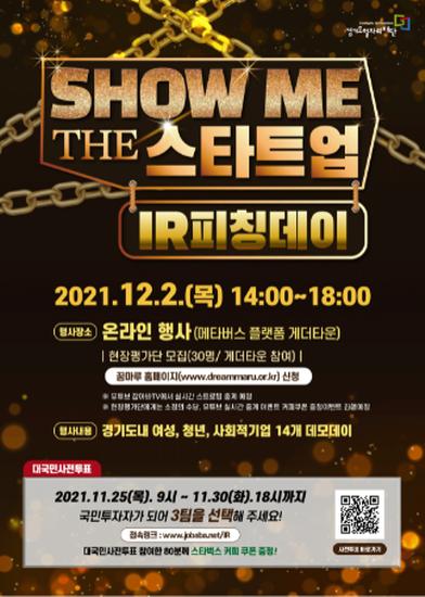 경기도일자리재단은 투자전문가뿐만 아니라 일반 국민들도 참여해 유망한 새싹기업(스타트업)을 뽑는 투자유치 발표 행사 ‘쇼미 더 스타트업 IR(투자유치)피칭데이’를 진행한다고 25일 밝혔다.