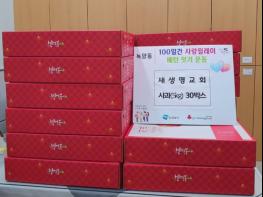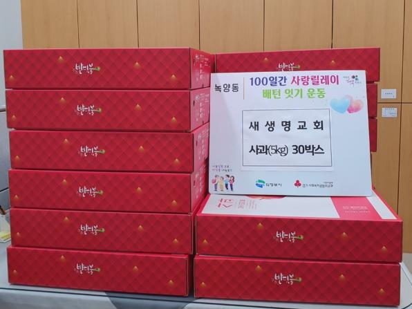 의정부시 녹양동은 11월 24일 녹양동 소재 새생명교회가 어려운 이웃들을 위해 사과(5kg) 30박스를 기부하며‘100일간 사랑릴레이 배턴잇기’에 동참했다고 밝혔다.