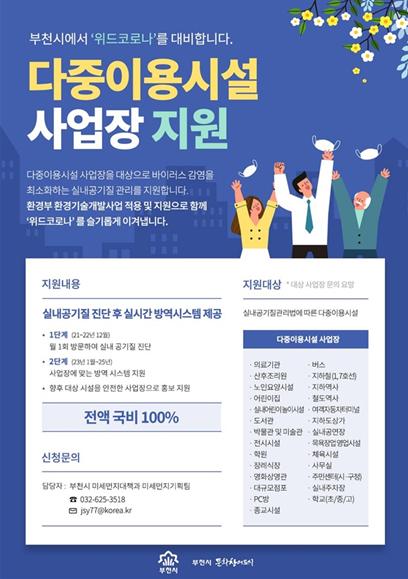 이에, 시는 환경부 환경기술개발사업을 부천시 소재 다중이용시설에 적용·지원키로 했다. 지원내용은 월 1회 방문하여 실내공기질을 진단하는 1단계와 사업장에 맞는 실시간 방역시스템을 지원하는 2단계로, 향후 대상 시설은 바이러스로부터 안전한 사업장으로 알려질 수 있도록 홍보도 지원할 예정이다.