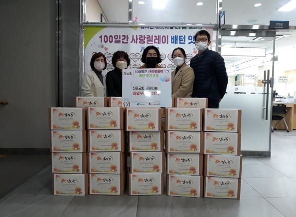 의정부시 가능동은 가능동에 소재한 신촌교회에서 11월 22일 관내 취약계층 어르신과 한부모가정 등 어려운 이웃들을 위해 가능동 주민센터에 과일꾸러미 24상자를 기탁했다고 밝혔다.
