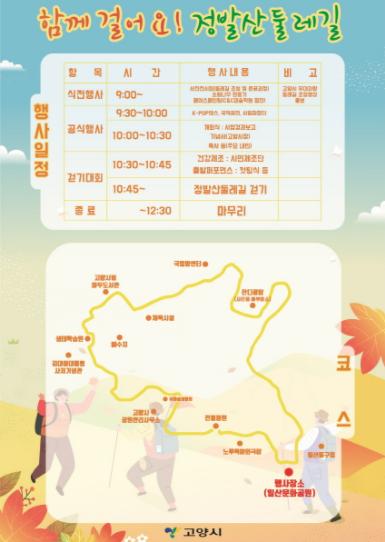 개장식은 고양시 문화예술단, K-POP댄싱팀 및 국악앙상블의 식전 행사를 시작으로 정발산둘레길 개장식과 둘레길 걷기행사 순으로 진행된다.
