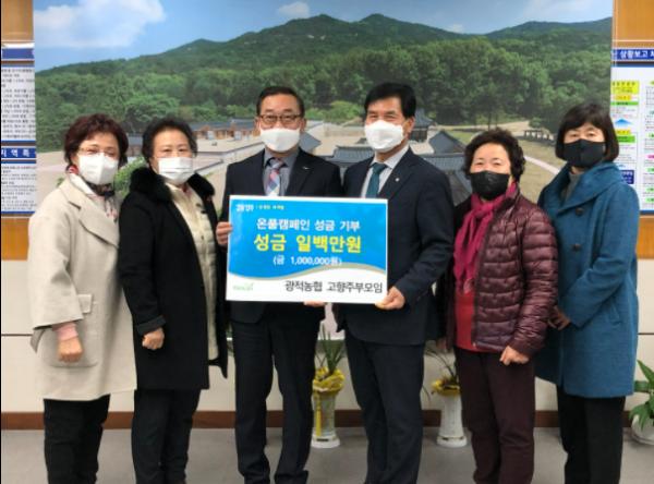 양주시 광적면은 26일 ‘광적농협 임직원 일동과 고향주부모임에서 온품캠페인 성금 300만원과 100만원을 각각 기탁했다고 밝혔다.