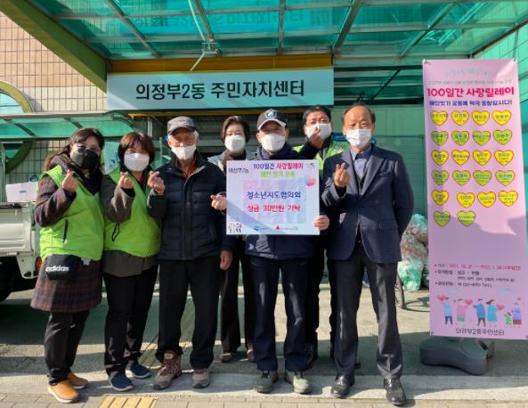 의정부시 의정부2동은 11월 25일 청소년지도협의회가 100일간 사랑릴레이 배턴 잇기 운동에 동참하기 위해 주민센터를 방문해 성금 30만 원을 기탁했다고 밝혔다.