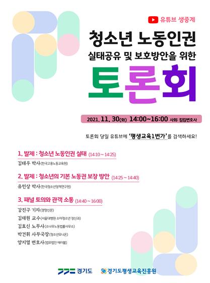 경기도평생교육진흥원이 11월 30일 오후 2시 ‘청소년 노동인권 실태공유 및 보호방안을 위한 토론회’를 온라인 비대면 방식으로 개최한다.