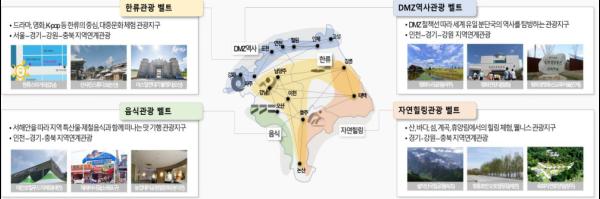 관광벨트로는 ▲인천 강화도에서 파주, 포천, 연천을 거쳐 강원 고성으로 이어지며 분단국 역사를 탐방하는 비무장지대(DMZ) 역사관광 벨트 ▲서울 강남, 오산(아스달연대기 촬영지), 충남 논산(미스터션샤인 촬영지) 등을 포함하는 한류관광 벨트 ▲인천 소래포구, 이천 쌀문화관 등 지역 특산물과 제철 음식을 즐길 수 있는 음식관광 벨트 ▲강원 속초부터 충북 제천까지 산·바다·계곡을 두루두루 다니는 자연힐링관광 벨트 등 4개가 정리됐다.