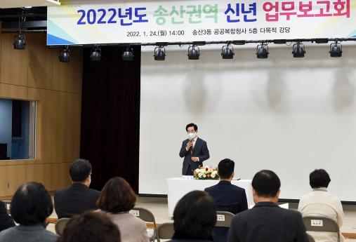 김동수 송산권역국장의 2022년 주요업무계획 보고, 주민과의 대화 순으로 진행된 이날 업무보고회는 최근 오미크론 변이 확산세가 심상치 않은 점을 감안해 ▲의정부시 3차 백신 접종실적, ▲다중이용시설 방역수칙 준수 점검 ▲코로나19 입원·격리자 생활지원비 및 소상공인 손실보상금 지원 ▲청소년 코로나19 백신 접종 홍보 등 송산권역의 코로나19 대응현황에 대해 상세하게 설명해 주민들이 안심할 수 있도록 했다.