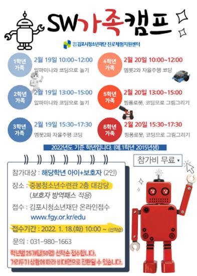 (재)김포시청소년재단 진로체험지원센터는 겨울 방학을 맞이하여 ‘가족이 함께하는 SW(소프트웨어) 캠프’를 주최한다. 초등학생을 대상으로 진행되는 이번 캠프는 학년별로 운영되므로 최대한 참가자 수준에 맞게 진행될 수 있을 것으로 예상된다.