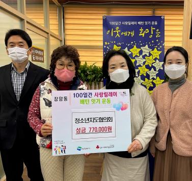 코로나19 상황에 따라 대면 행사가 대폭 축소되는 어려움을 겪었으나, 100일간 사랑 릴레이 배턴 잇기에 적극적으로 동참하며 관내 위기가구에 도움이 되길 바란다는 뜻을 전했다.