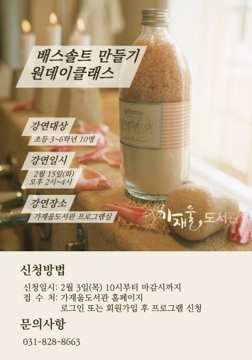 의정부시 가재울도서관은 2월 15일 초등 고학년을 대상으로 2월 사서컬렉션 연계프로그램 배스솔트 만들기 원데이클래스를 운영한다고 밝혔다.