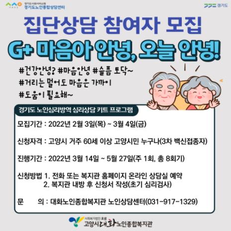 오는 3월 14일부터 시작하는'G 마음아 안녕, 오늘 안녕!'집단 프로그램은 코로나19로 사회적 활동과 일상생활의 고립이나 축소 등으로 코로나 우울을 겪는 어르신들에게 ‘상담키트’를 활용하여 스스로 자신의 건강과 안전을 보호 할 수 있도록 부정적 정서를 낮추고 일상적 회복을 돕기 위한 프로그램이다.