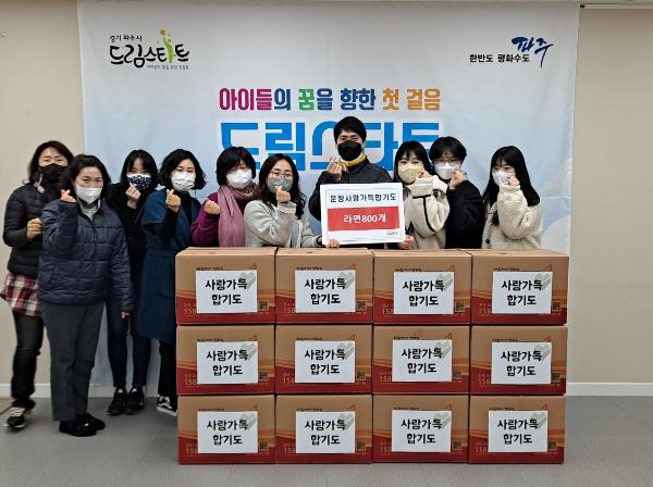 파주시는 운정사랑가득합기도에서 사랑과 나눔의 마음을 모은 라면 800봉지를 파주시 드림스타트에 후원했다고 밝혔다.